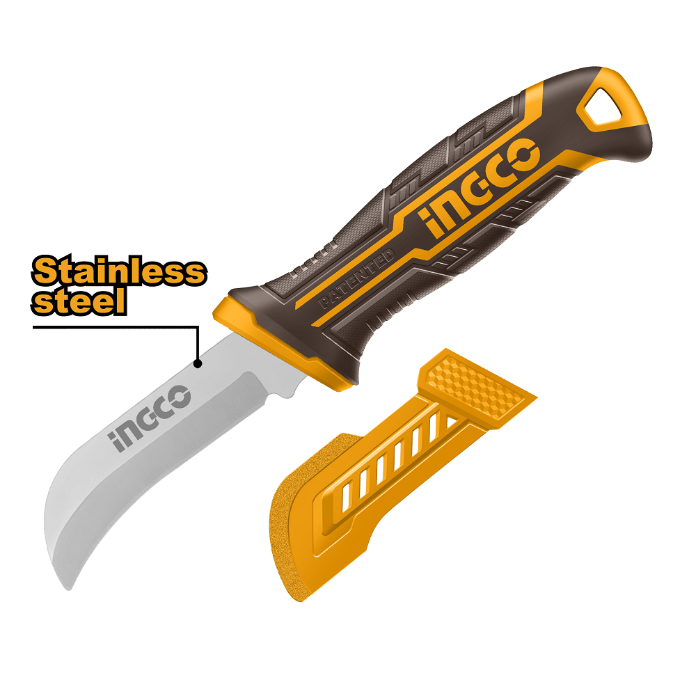 Ніж електрика INGCO з вигнутим лезом 200 мм призначений для професійних електромонтажних робіт, включаючи зачистку кабелю та різання ізоляції.